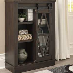 Put your love of modern farmhouse living on display with this accent cabinet. Rich brown or Antique white finish and sliding "barn door" make it loaded with character. Four adjustable shelves are packed with potential.